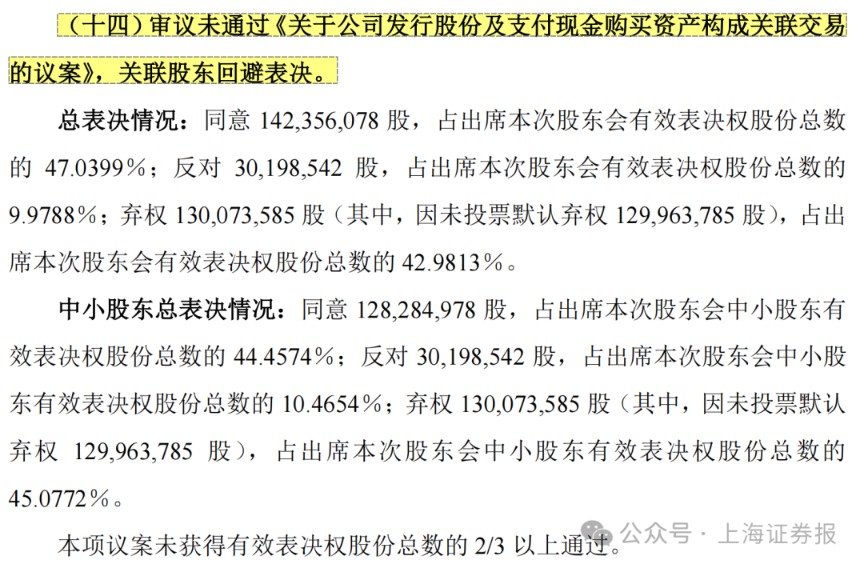 以《关于公司发行股份及支付现金购买资产构成关联交易的议案》为例,总表决情况为:同意1.42亿股,占出席本次股东会有效表决权股份总数的47.04%;反对3019.85万股,占出席本次股东会有效表决权股份总数的9.98%,其中反对票均由中小股东投出。