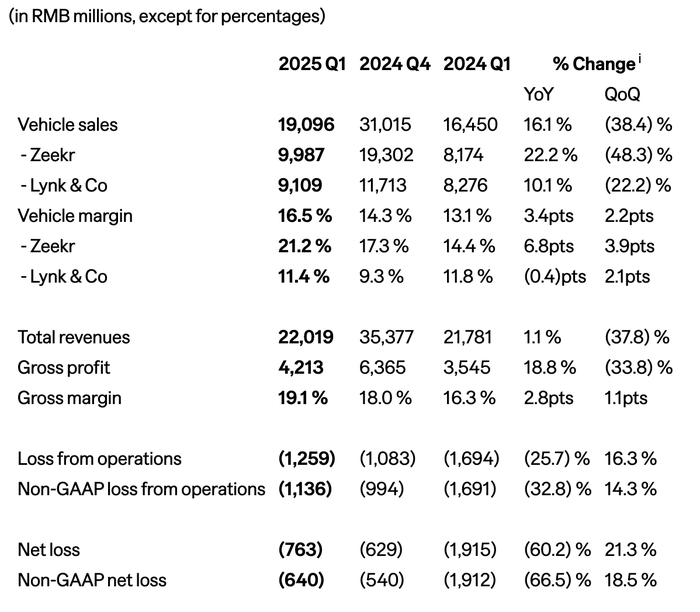 5月15日,极氪科技集团2025年第一季度财报:总营收为人民币220.19亿元,同比增长1.1%,环比下降37.8%;净亏损为7.63亿元,同比收窄60.2%,环比扩大21.3%。