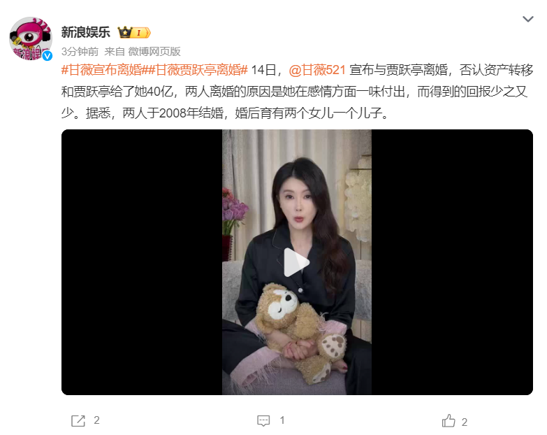 14日,@甘薇521 宣布与贾跃亭离婚,否认资产转移和贾跃亭给了她40亿,两人离婚的原因是她在感情方面一味付出,而得到的回报少之又少。据悉,两人于2008年结婚,婚后育有两个女儿一个儿子。