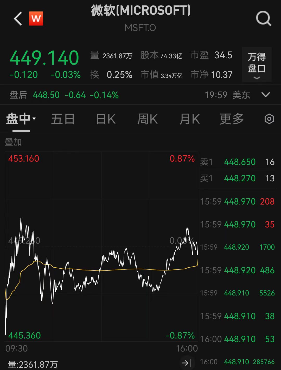 当地时间周二,微软股价微跌0.03%,报449.14美元/股,总市值达3.34万亿美元。
