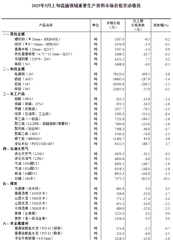 国家统计局14日在官网发布2025年5月上旬流通领域重要生产资料市场价格变动情况,据对全国流通领域9大类50种重要生产资料市场价格的监测显示,2025年5月上旬与4月下旬相比,12种产品价格上涨,32种下降,6种持平。