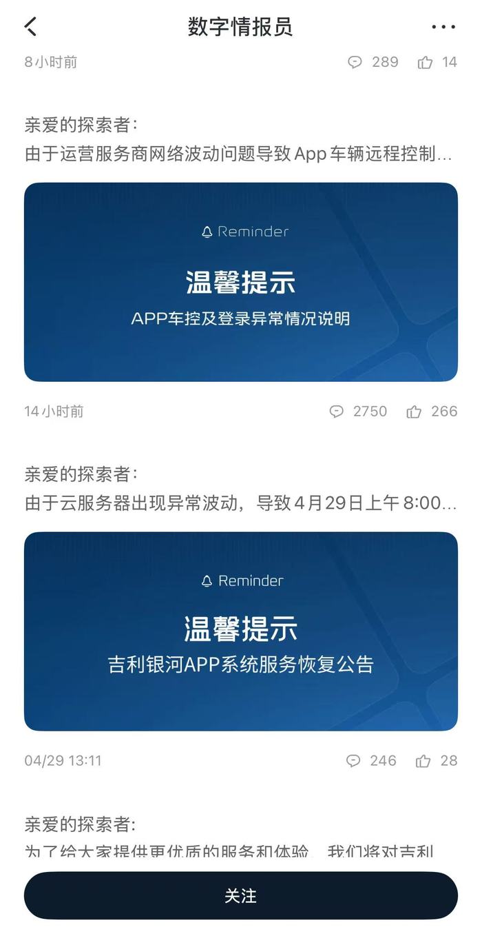 值得注意的是,这两起事故均发生在吉利银河App系统维护后不久。4月14日,吉利银河官方发布公告称:“为了给大家提供更优质的服务和体验,我们将对吉利银河App进行系统维护。”