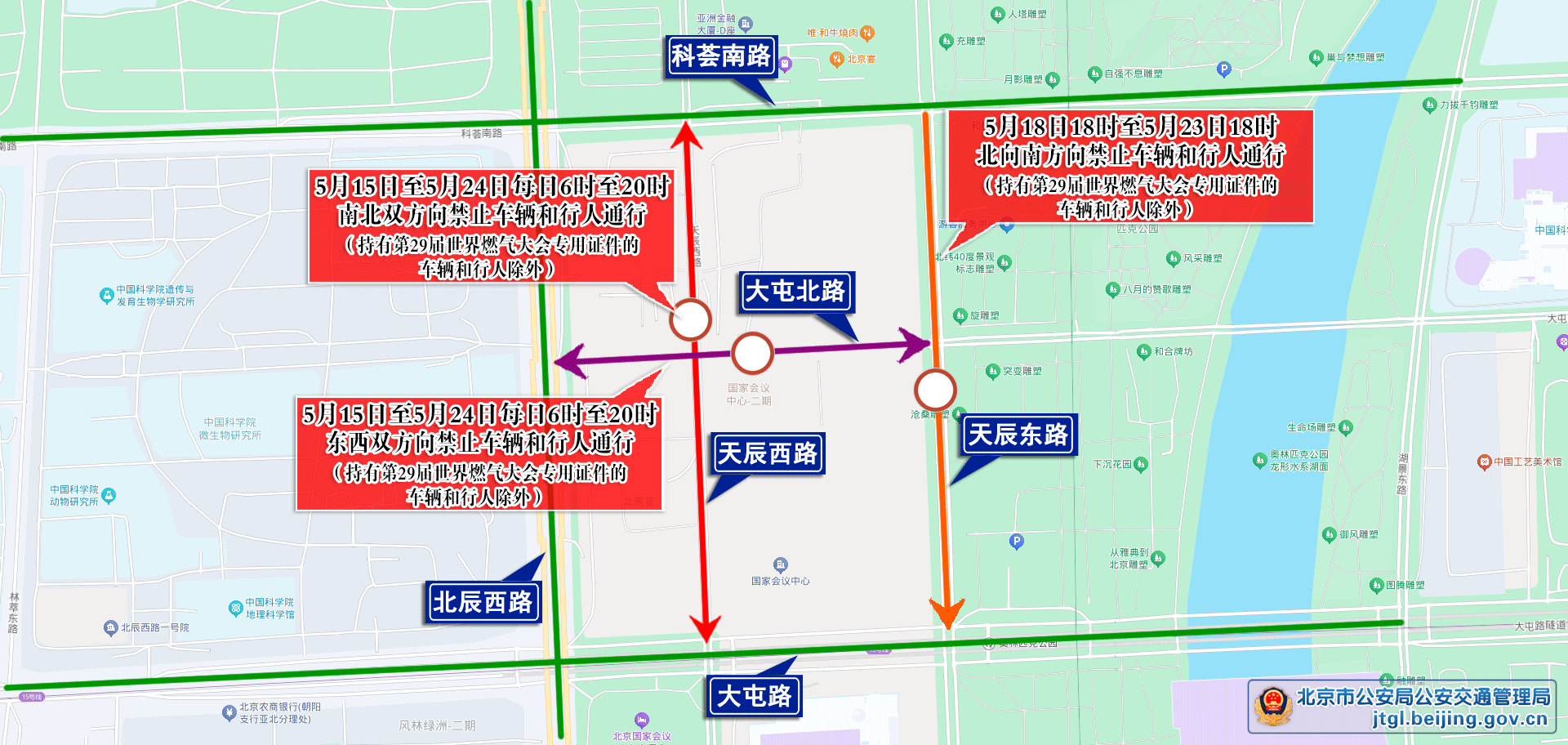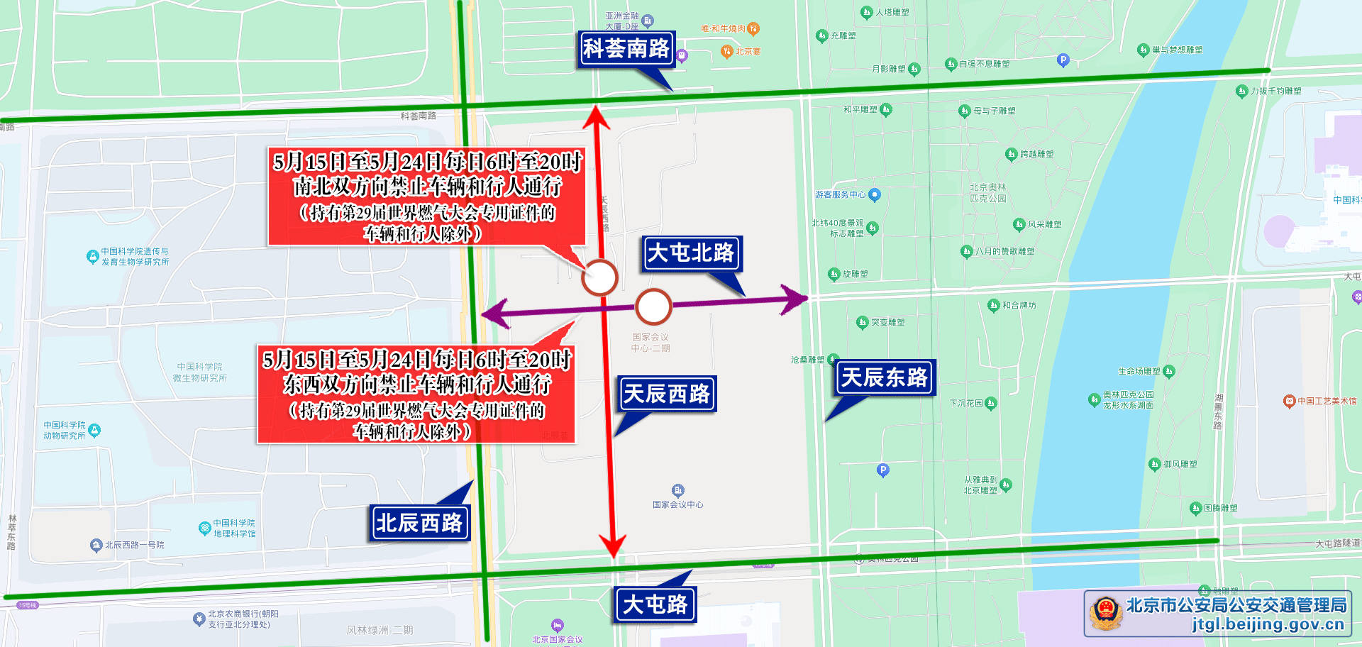 (一)5月15日至5月24日每日6时至20时,朝阳区天辰西路由大屯路与天辰西路交叉口(不含)至科荟南路与天辰西路交叉口(不含)南北双方向,大屯北路由北辰西路与大屯北路交叉口(不含)至天辰东路与大屯北路交叉口(不含)东西双方向,除持有第29届世界燃气大会专用证件的车辆和行人外,禁止其他车辆和行人通行。途经车辆和行人可经北辰西路、大屯路、科荟南路绕行。