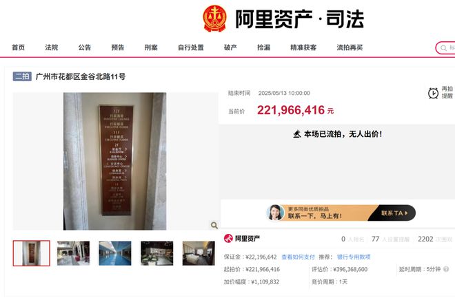 5月13日上午,广州富力空港假日酒店二拍流拍,此次拍卖共77人设置提醒,超2200次围观。