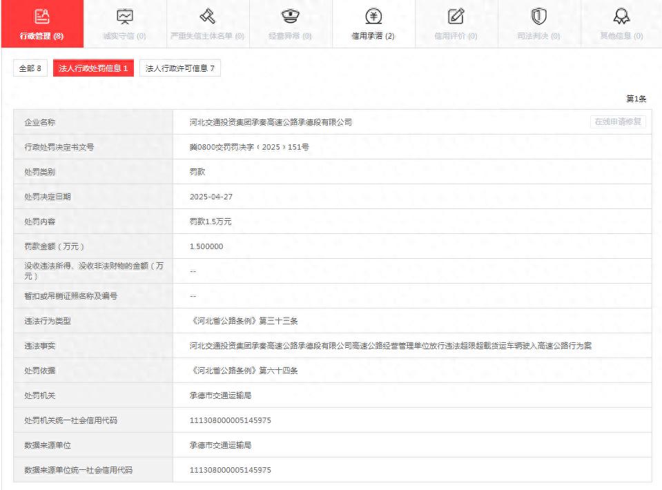 内容显示,河北交投承秦公司的违法事实为:高速公路经营管理单位放行违法超限超载货运车辆驶入高速公路行为。对此,承德市交通运输局依据《河北省公路条例》第六十四条,对其罚款1.5万元。行政处罚决定书文号:冀0800交罚罚决字﹝2025﹞151号。