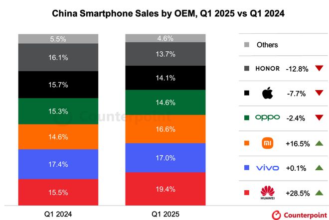 2025年第一季度,在市场调研机构IDC和Canalys的统计中,荣耀均已跌出中国大陆智能手机市场出货量前五。在Counterpoint的统计中,荣耀以13.7%的市占率,位列第六,出货量同比下滑12.8%。