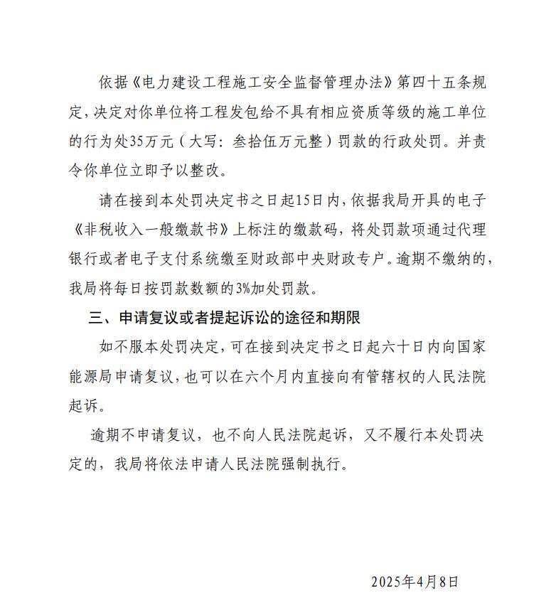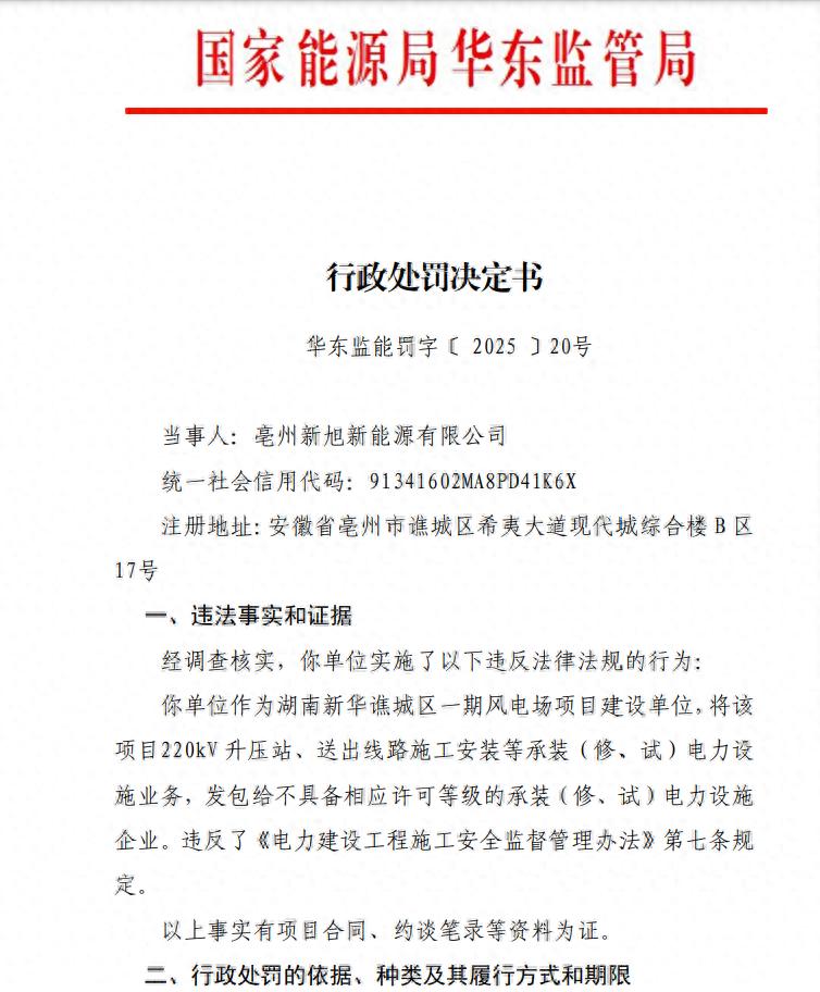 日前,国家能源局华东监管局发布了对亳州新旭新能源有限公司行政处罚决定。华东监能罚字〔 2025 〕20号行政处罚决定书显示,亳州新旭新能源有限公司作为湖南新华谯城区一期风电场项目建设单位,将该项目220kV升压站、送出线路施工安装等承装(修、试)电力设施业务,发包给不具备相应许可等级的承装(修、试)电力设施企业。违反了《电力建设工程施工安全监督管理办法》第七条规定。