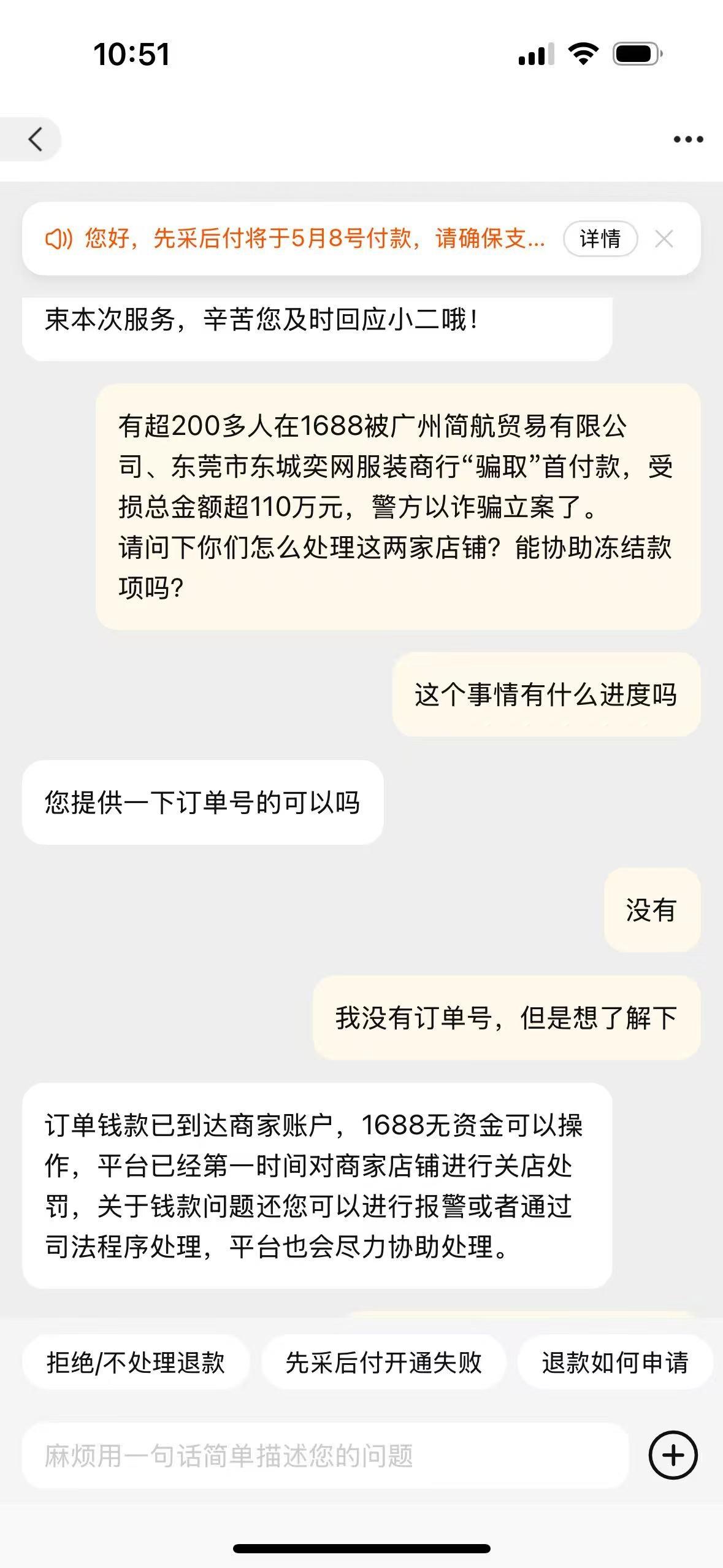 发觉被骗的林弘,立即在1688平台发起了投诉,但订单页面并无退款选项。平台客服回应称:“商家已被处理闭店,您付款时选择了73分阶段模式,定金部分已实时打款至对方账户,平台无法追回,建议您通过其他渠道维权。”