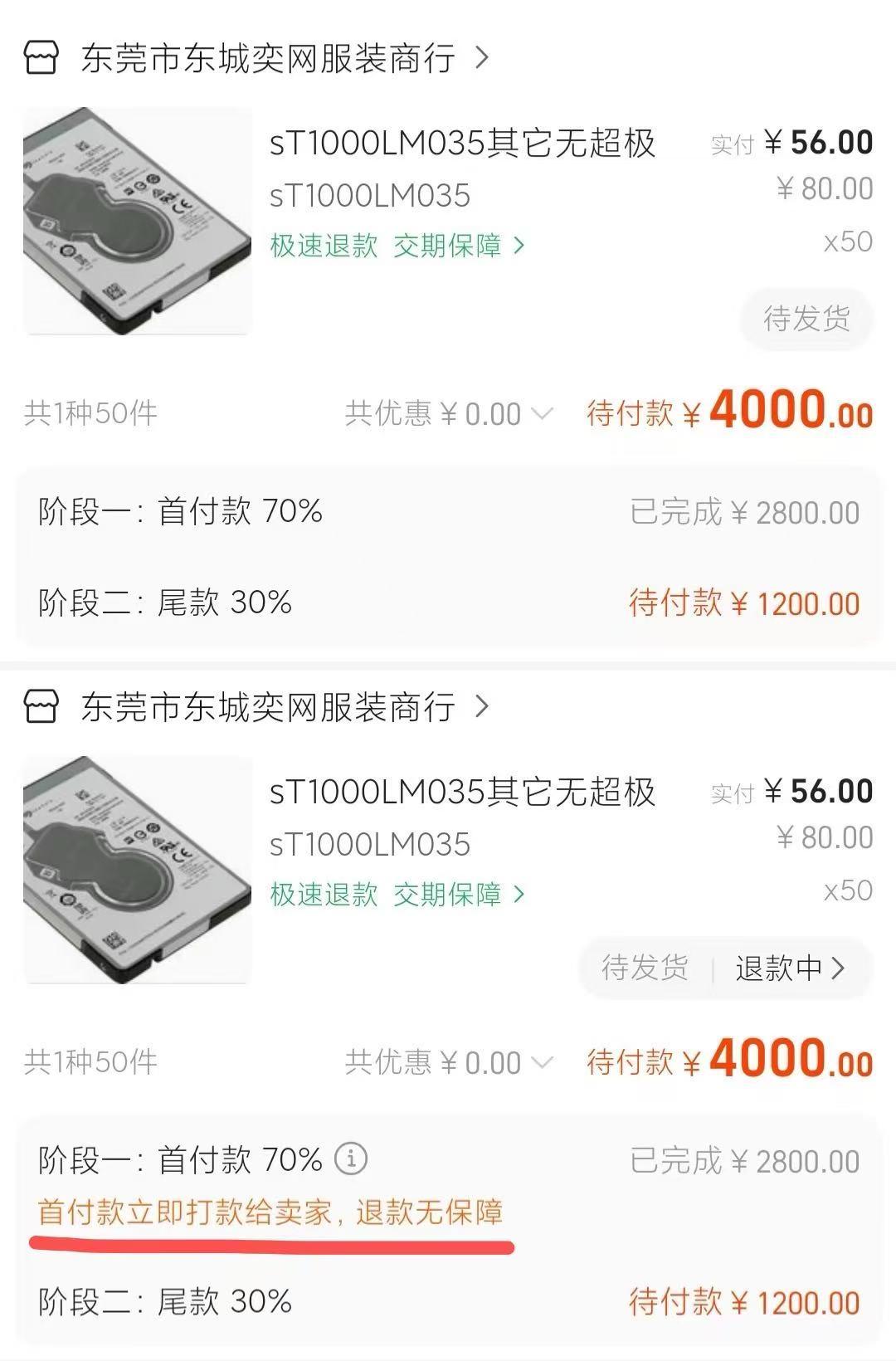 (上图:1688原手机端分阶段付款页面,下图:1688新增风险提示)