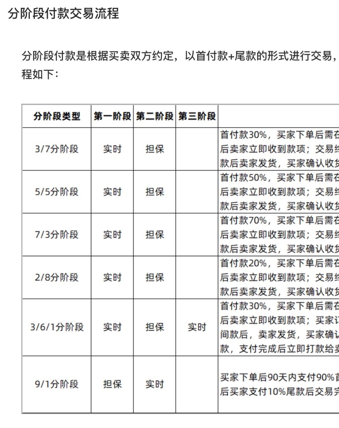 1688客服对九派财经解释,“分阶段付款”是平台在多年前推出的交易形式,是为解决加工定制、订购、预售中的资金账期问题。具体是指,根据买卖双方约定,可以以首付款+尾款的形式进行交易,首付款均在付款时“实时”打款给商家,尾款由平台担保。