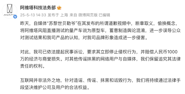 5月13日下午,阿维塔科技法务部发布声明称,昨天,自媒体“苏黎世贝勒爷”在其发布的所谓道歉视频中,断章取义,偷换概念,将阿维塔风阻直播测试的量产车说为原型车,蓄意制造舆论混淆,进一步误导公众对测试结果和公司产品的认知,对公司品牌形象造成进一步侵害。对此,公司已依法提起民事诉讼,要求其立即停止侵权行为,并赔偿人民币1000万的经济与商誉损失。