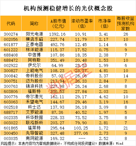 从未来增长潜力来看,根据5家以上机构一致预测,今明两年净利润增速均有望超10%的光伏概念股有21只。截至5月12日收盘,这些概念股中,阳光电源、横店东磁、正泰电器、林洋能源、中信博5股市盈率低于20倍。