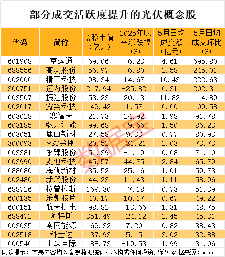 近期部分概念股成交活跃度出现明显提升。数据宝统计,截至5月12日收盘,5月以来日均成交额较上个月增幅超20%的光伏概念股有26只。京运通、高测股份、精工科技、迈为股份、振江股份、露笑科技6股日均成交额环比增幅翻倍。京运通成交额环比增幅为695.8%,排在第一位,该股今日早盘封住涨停板。