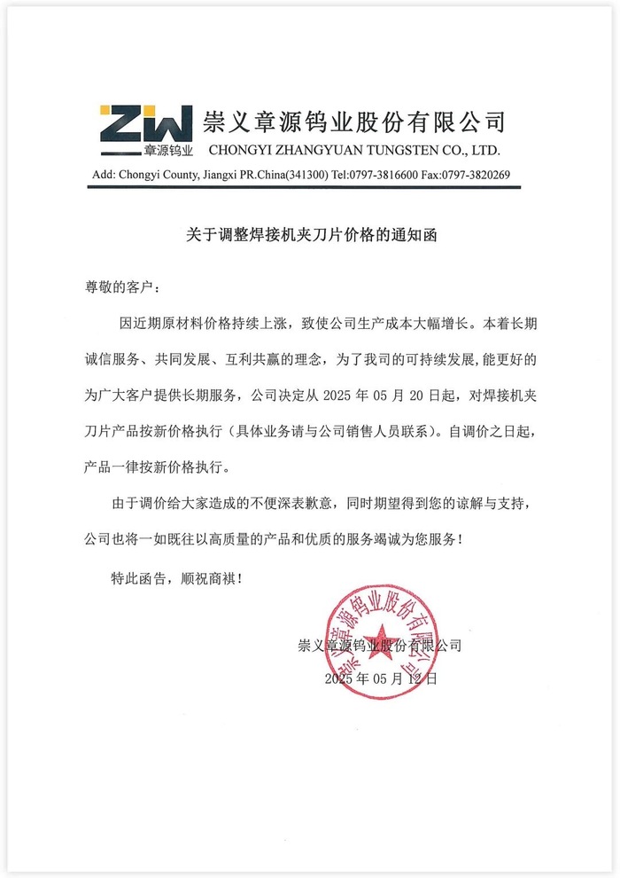 5月12日,章源钨业发布关于调整焊接机夹刀片价格的通知函,因近期原材料价格持续上涨,致使公司生产成本大幅增长。公司决定从5月20日起,对焊接机夹刀片产品按新价格执行。