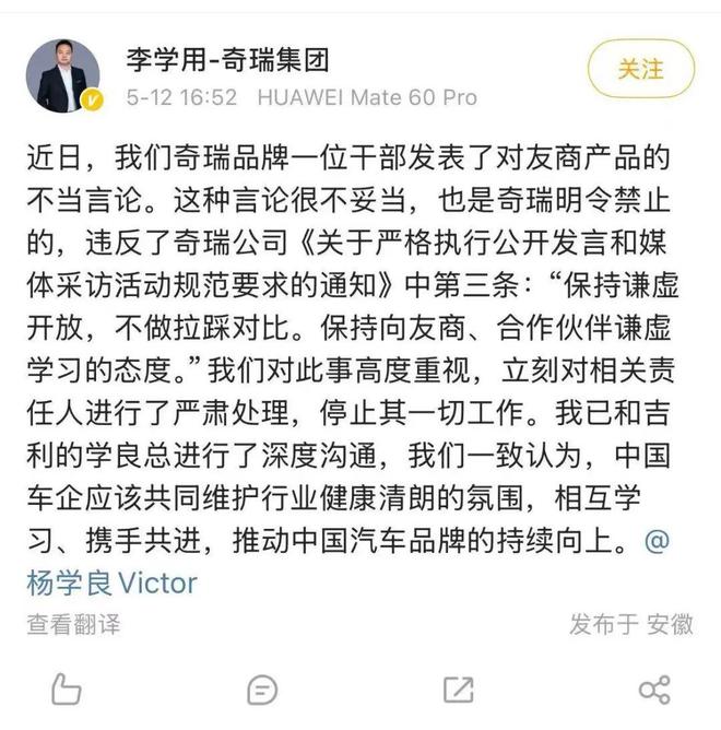 随后,浙江吉利控股集团高级副总裁杨学良转发李学用微博称,奇瑞这种规范管理和令行禁止值得学习,希望大家都引以为戒,严于律己,美美与共,发挥头部企业表率作用,推动中国汽车市场规范健康发展,用好技术好产品和好口碑为用户创造价值。
