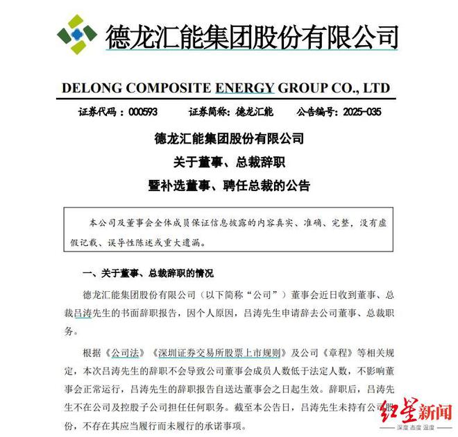 5月10日,德龙汇能(000593.SZ)发布公告,董事吕涛因个人原因辞去公司董事及总裁职务,辞职后将不再担任公司及控股子公司任何职务。截至公告日,吕涛未持有公司股份,不存在未履行的承诺事项。