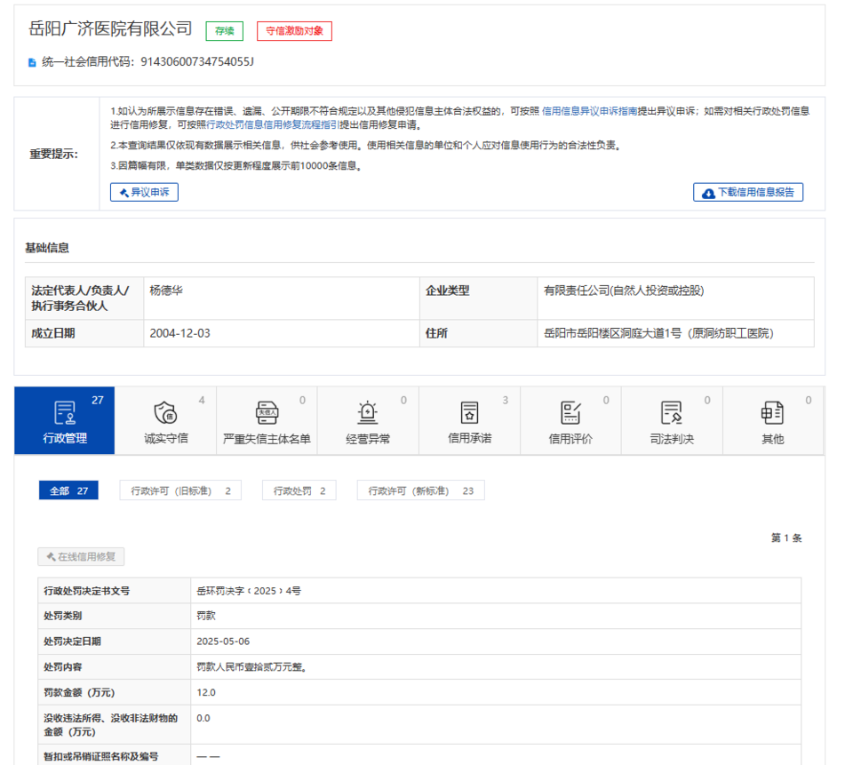 近日,记者从信用中国官网获悉,岳阳广济医院有限公司因环保问题被岳阳市生态环境局罚款120000元。