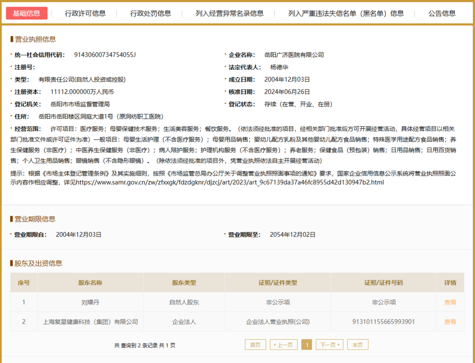 公开信息显示,岳阳广济医院有限公司成立于2004年12月3日,法定代表人杨德华,公司大股东为上海复星健康科技(集团)有限公司。
