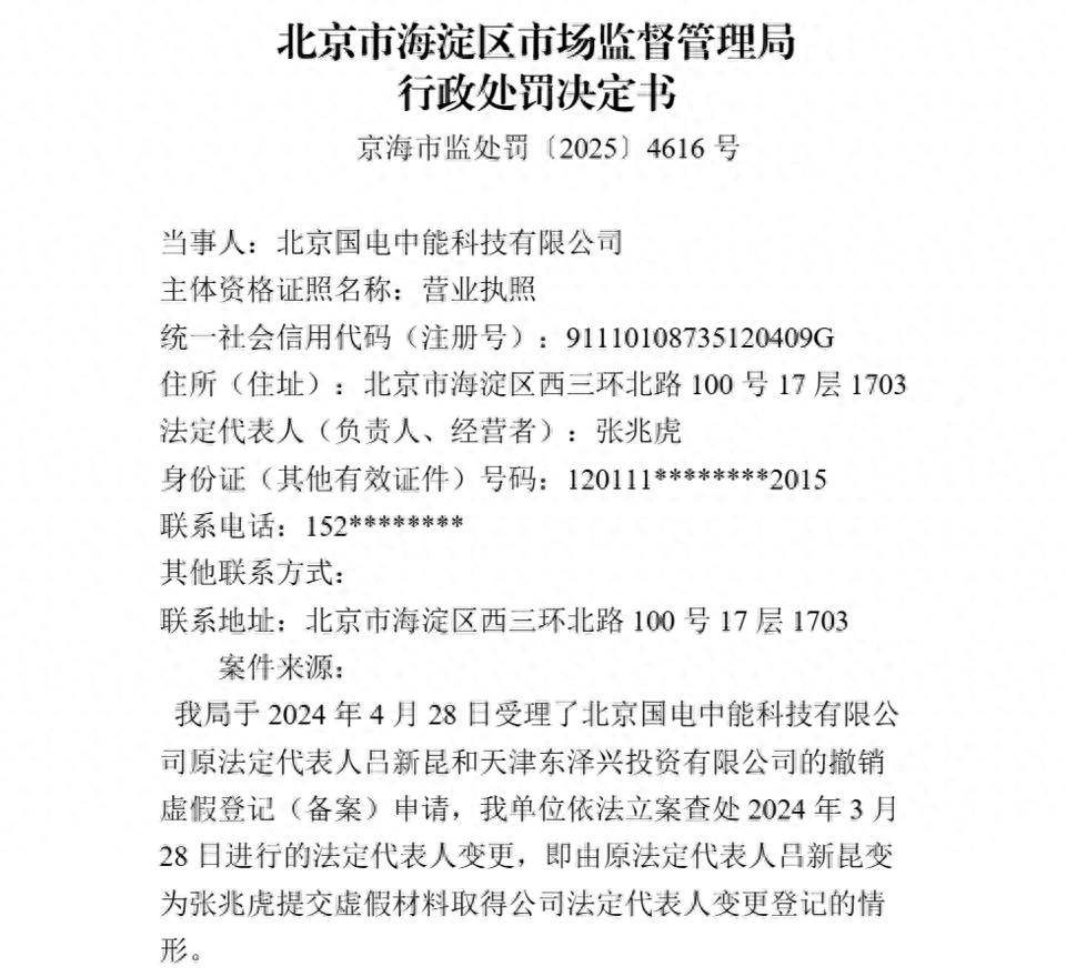 执法人员调取北京国电中能科技有限公司企业档案,发现当事人于2024年3月28日取得公司法定代表人变更登记。在向登记机关提交的设立登记资料中,当事人在 2024年3月27日召开的《北京国电中能科技有限公司股东会决议》中显示“1.免去吕新昆的执行董事职务,不再担任公司法定代表人。2.同意选举张兆虎为执行董事,担任公司法定代表人。”在该页内容中有唐山昊宇投资有限公司盖章及法定代表人武如义签字和天津东泽兴投资有限公司盖章及法定代表人于佩清签字。