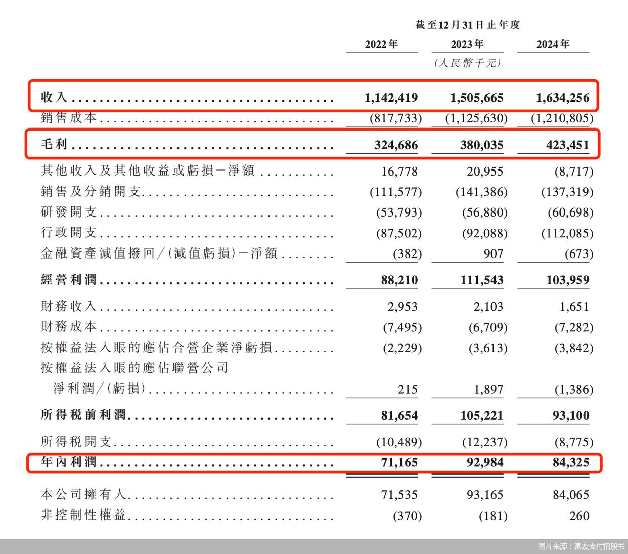 北京商报记者进一步对比发现,富友支付本次递交的招股书更新了2024年营收情况,2024年公司增收不增利。数据显示,2022年、2023年及2024年间,富友支付的收入分别约为11.42亿元、15.06亿元、16.34亿元;同期年内利润分别为7116.5万元、9298.4万元、8432.5万元。同期,富友支付毛利率由2022年的28.4%降至2023年的25.2%,2024年则为25.9%。