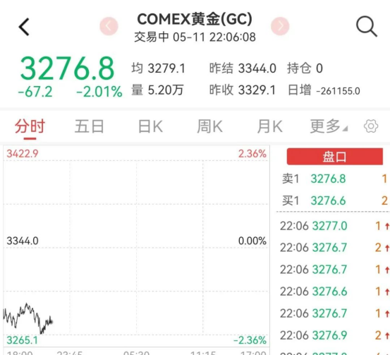 5月12日,国际金价大跌。现货黄金日内跌幅达到2.01%,报3270.99美元/盎司;COMEX黄金期货主力最新报3276.8美元/盎司,日内跌超2%。