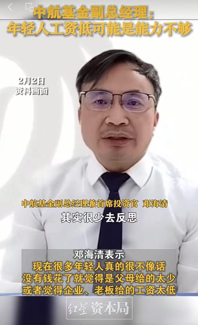 作为行业知名经济学家,邓海清过去频繁对外发声,曾引发争议。据公开报道,2023年2月,邓海清在接受采访时提到,“很多年轻人很不像话,没钱花了,觉得企业老板给的工资太低,没有反思是自己的素质能力不够”“你干的这点活在泰国或是越南,人家可能只你一半的工资”。此番言论一出,“年轻人工资低可能是能力不够”词条连续两天占据微博热搜第一。