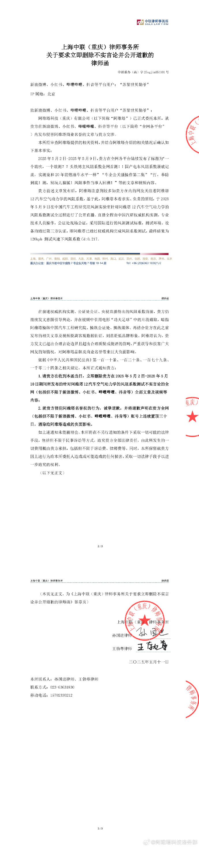 5月12日,阿维塔科技法务部对外发布递给博主“苏黎世贝勒爷”的律师函,并在函中提出了两点要求,如不执行将追究法律责任。阿维塔要求该博主删除所发布的针对阿维塔12汽车空气动力学的风阻系数测试不实言论的全网全部文章及视频等内容;并就侵犯阿维塔名誉权的行为,诚挚道歉,并将道歉声明在全网账号上连续置顶三十日,消除给阿维塔造成的负面影响。