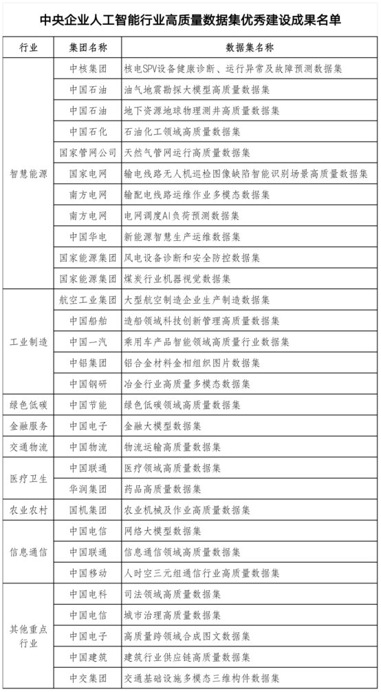 据国资小新微信公众号5月8日消息,第八届数字中国建设峰会期间,国务院国资委集中发布了首批10余个行业30项央企人工智能行业高质量数据集优秀建设成果;首批成立交通物流、绿色低碳、智慧能源等三大行业中央企业数据产业共同体,后续将梯次成立其他重点行业央企数据产业共同体,深化数据资源开发利用和开放共享,以高质量数据集建设赋能大模型训练、助力高价值场景落地。