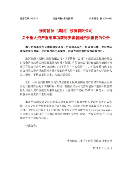 近日,公司收到控股股东转发的安徽省人民政府国有资产监督管理委员会做出的《省国资委关于淮南矿业(集团)有限责任公司与淮河能源(集团)股份有限公司重大资产重组有关事项的批复》(皖国资产权函〔2025〕158号),原则同意公司重大资产重组方案。