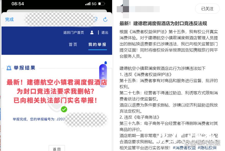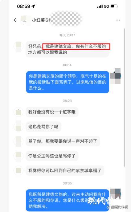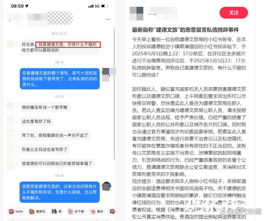 事后,张女士将此次入住的不愉快经历发在了社交平台上,吐槽该酒店服务差。5月6日,一名自称“建德文旅”工作人员的账号,在其投诉帖下多次用不当言词评论,还多次发私信给她留言挑衅,“对方声称自己就是‘建德文旅’的,并表示‘有什么不服可以跟他说’。我怀疑对方冒充‘建德文旅’工作人员,恶意损害建德文旅的形象以及建德文旅口碑,所以选择了报警处理。”张女士说。