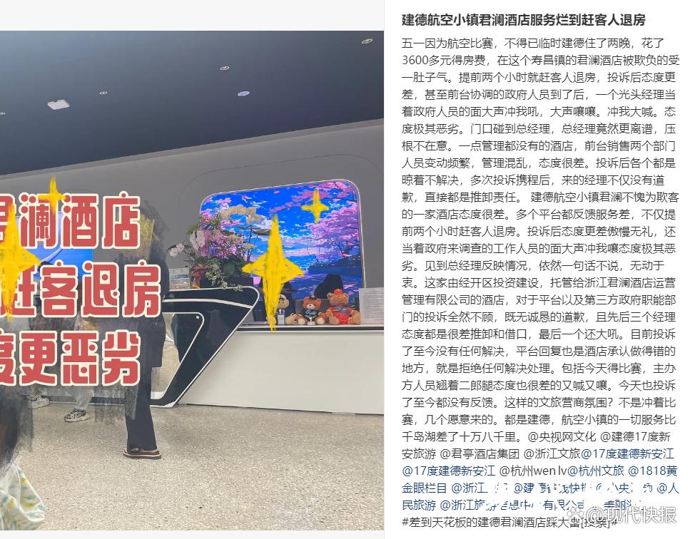 张女士告诉记者,五一假期,她在浙江省建德市建德航空小镇某酒店订了两晚共4个房间,计划5月3日退房。“当初订房时,订单明确酒店是下午2点退房。”张女士说,没想到3日当天刚过12点酒店就打来电话要求退房,这令她很恼火。之后,她多次向订酒店的平台以及当地文旅等多部门投诉,之后政府部门调查人员赶来处理。