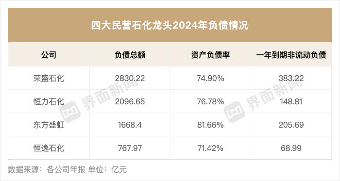 截至去年底,荣盛石化、恒力石化、东方盛虹三家公司负债总额均破千亿元,四家公司负债率均超过70%。其中,荣盛石化和恒力石化负债总额突破2000亿元。