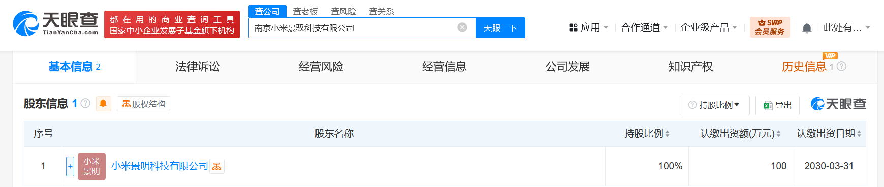 天眼查App显示,近日,南京小米景驭科技有限公司成立,法定代表人为王振锁,注册资本100万人民币,经营范围含新能源汽车整车销售、汽车销售、智能车载设备销售、充电桩销售、集中式快速充电站、新能源汽车换电设施销售、蓄电池租赁、互联网销售等。股东信息显示,该公司由小米集团旗下小米景明科技有限公司全资持股。