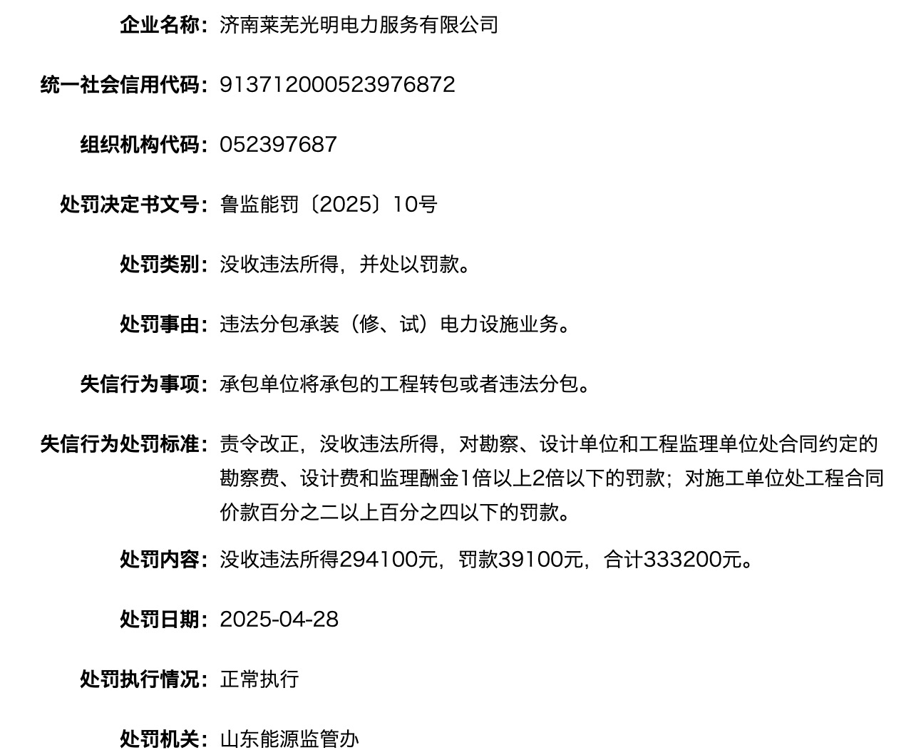 近日,国家能源局资质和信用信息系统披露处罚信息显示,济南莱芜光明电力服务有限公司,因违法分包承装(修、试)电力设施业务,被山东能源监管办没收违法所得294100元,罚款39100元,合计333200元。。