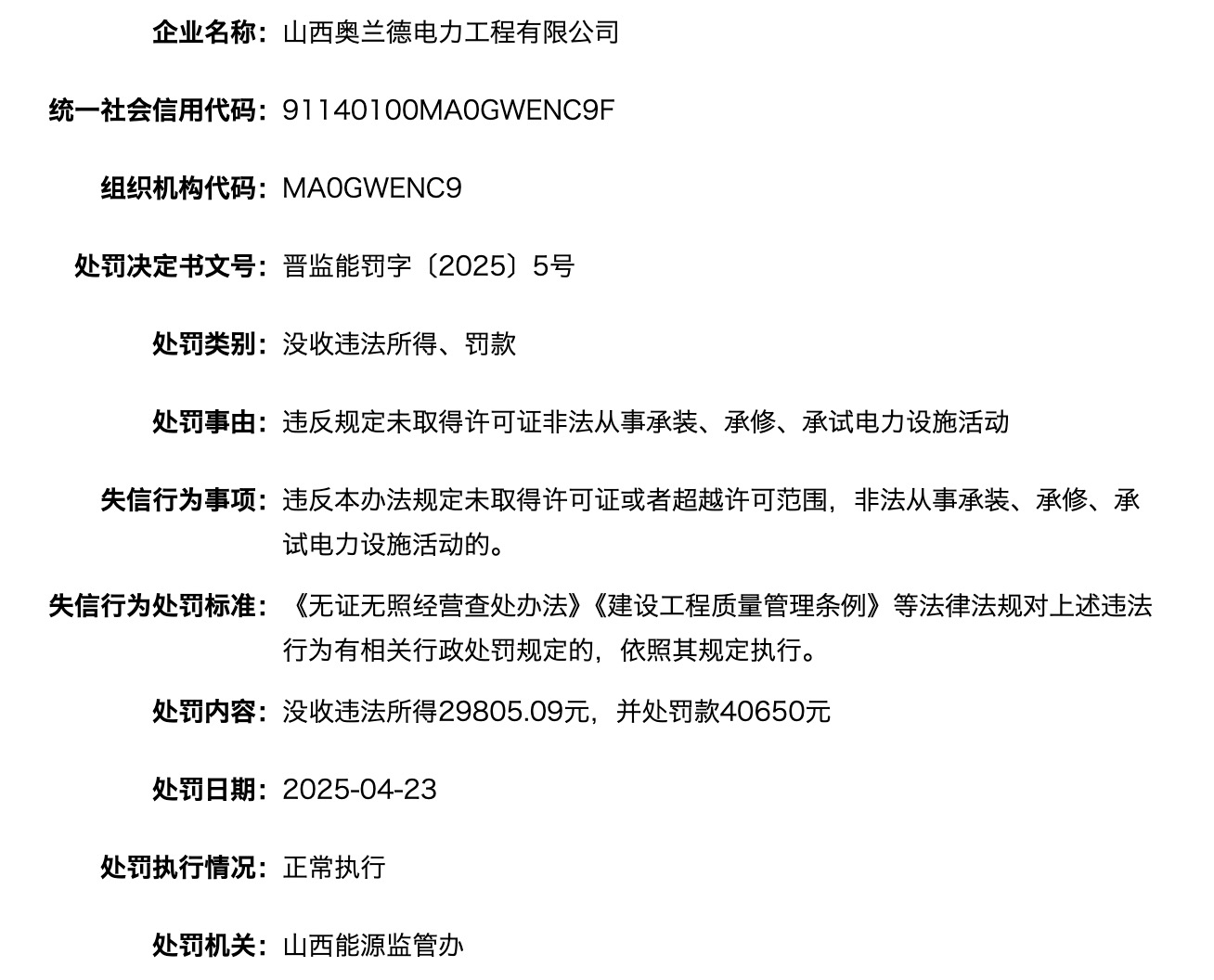 近日,国家能源局资质和信用信息系统披露处罚信息显示,山西奥兰德电力工程有限公司,因违反规定未取得许可证非法从事承装、承修、承试电力设施活动,被山西能源监管办没收违法所得29805.09元,并处罚款40650元。