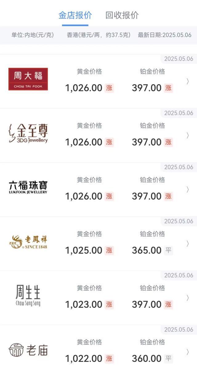 国内金饰价格随之上扬,再度涨回千元人民币关口。6日,老庙足金金饰品报价1022元/克,周生生足金金饰品报价1023元/克,周大福足金金饰品报价1026元/克。