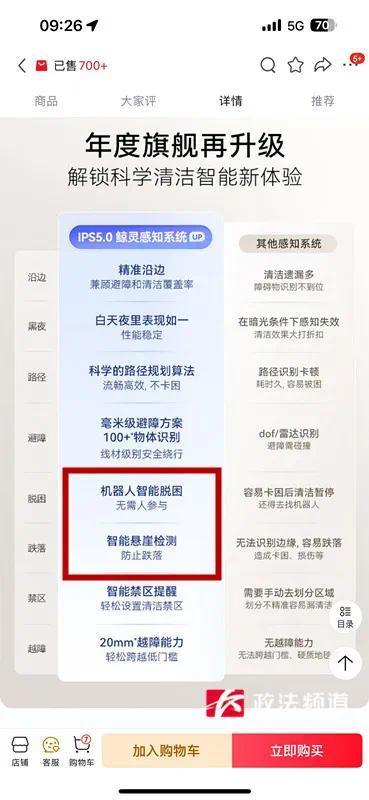 “我‘双12’期间在电商平台云鲸特卖店购买了一个云鲸J5的扫地机器人,当时选购的过程中,他们在宣传页面上有8大功能,其中有功能就是脱困,他说机器人能够智能脱困,无需人参与,可以智能悬崖检测,防止跌落,当时我看到就下定决心就购买了。”李先生表示。