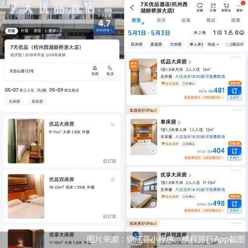 其实,不仅是“五一”假期期间,北京商报记者在锦江荟小程序看到,7天优品(杭州西湖断桥浙大店)在“五一”假期过后的其他日期,也均显示全部房间均已订完。