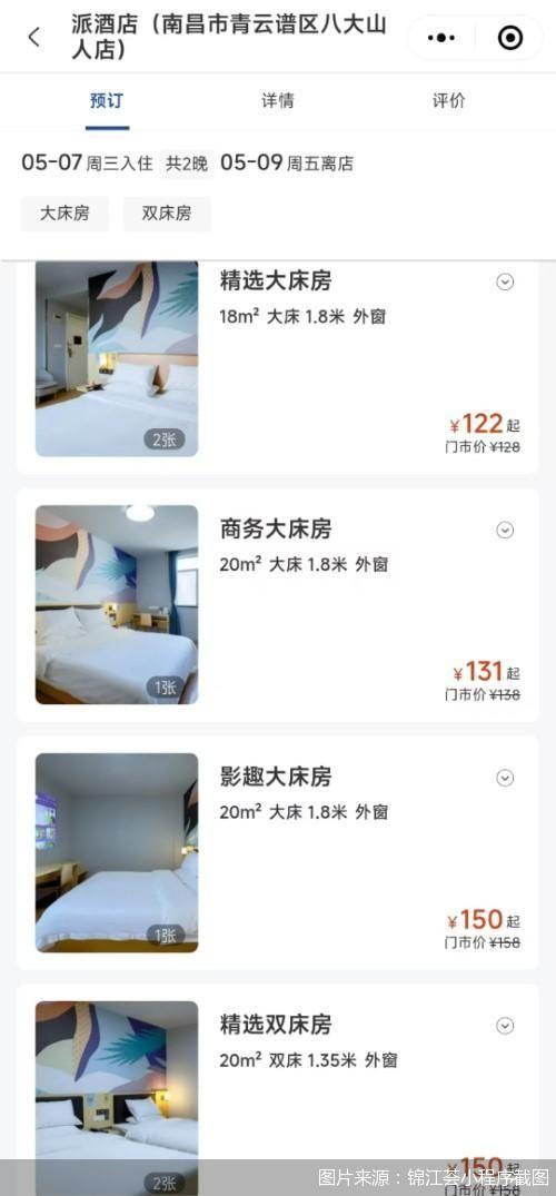 北京商报记者在联系锦江酒店集团后,于5月6日再次查询,派酒店(南昌市青云谱区八大山人店)5月7日—9日精选双床房在锦江荟价格已经修改为150元/晚。不过,7天优品(杭州西湖断桥浙大店)在锦江荟仍然显示“订完”状态。