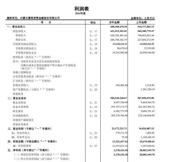 近日,蒙商消费金融披露了2024年度报告。根据报告,该公司全年实现营业总收入6.08亿元,较上年增长11.56%;但净利润却从2808万元断崖式下跌至227.8万元,同比锐减91.89%。截至2024年末,公司总资产规模达76.47亿元,同比增幅22.6%,负债规模同步攀升至69.6亿元。