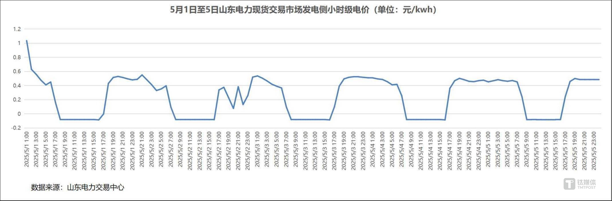 最突出的还是山东,5天假期120个小时中,山东电力现货交易市场发电侧出现了约46个小时的负电价(5月1日至4日取实时市场数据,5日实时市场数据暂未公布,取日前市场数据,用电侧约45小时),几乎每天的8点到16点,都是负电价时段。
