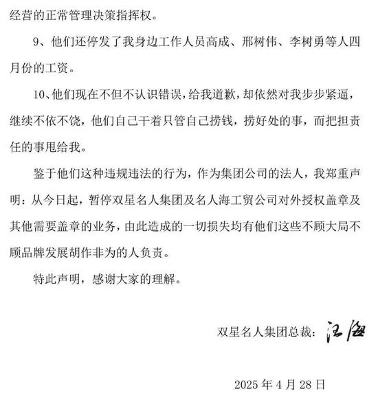 在这封公开信中,汪海称,自己在2025年4月份遭遇了限制人身自由,被威逼交出集团管理权等相关内容。公开信的署名为双星名人集团董事长汪海。