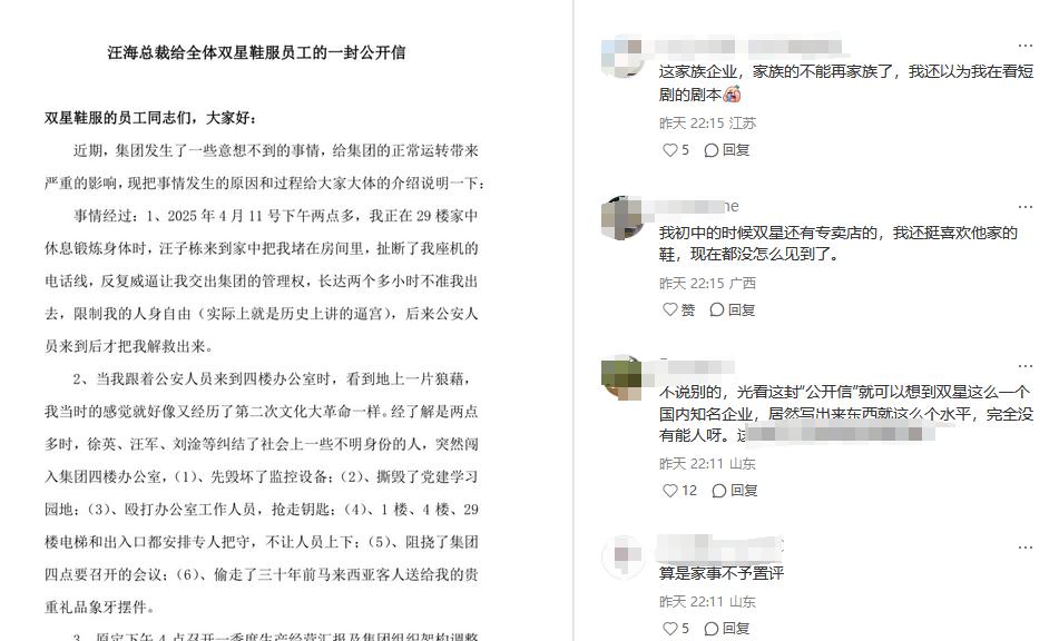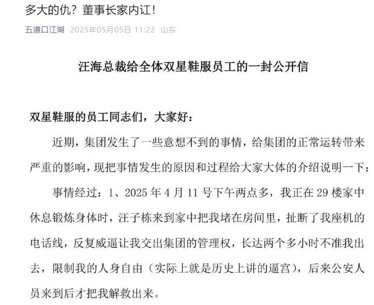 5月5日,“五道口江湖”等财经自媒体发布了双星鞋服集团董事长汪海的公开信,称“董事长家内讧?”