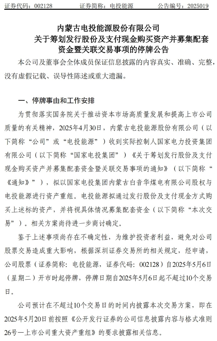 目前,相关方案尚待进一步商讨确定,尚存在不确定性,电投能源预计在不超过10个交易日的时间内披露本次交易方案。公司股票将在5月6日开市起停牌。