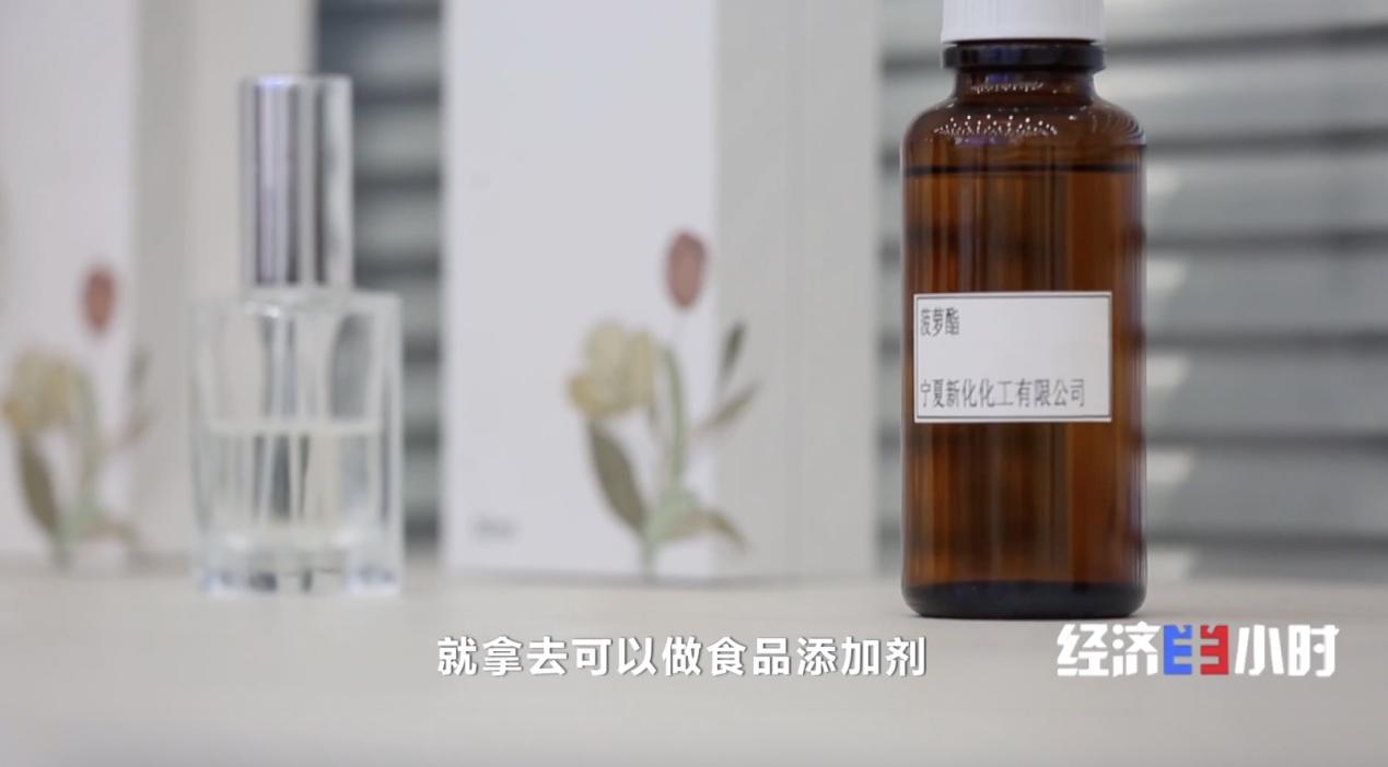 宁夏新化化工有限公司董事长 王平:作为合成香料的基础原料,它可以做食品添加剂,香烟、白酒、蛋糕,饼干里面都可以用 ,还能做成香水、洗衣液、洗头膏、洗面奶等日化产品。