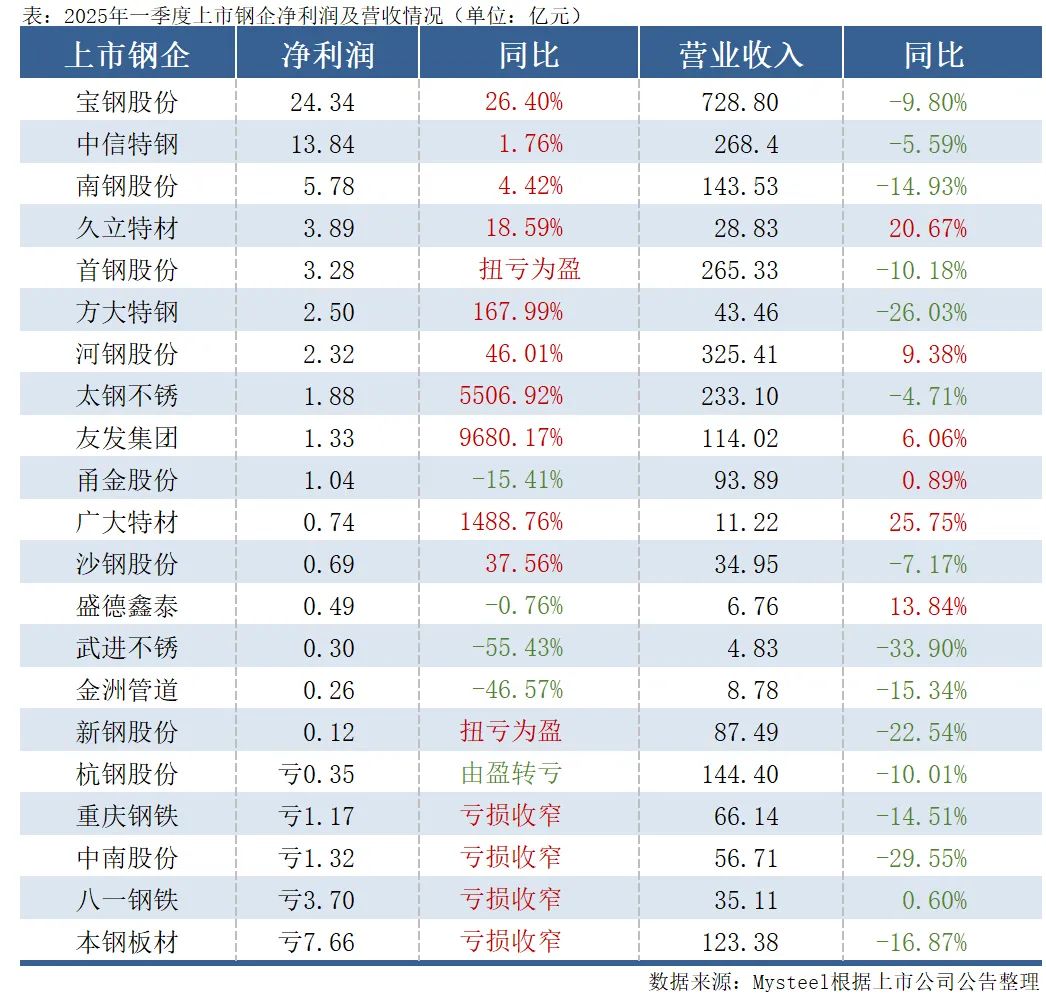 截至4月底,有21家上市钢企公布2025年一季度业绩,近八成的上市钢企盈利。从净利润来看,宝钢股份净利润24.34亿元排名第一,中信特钢净利润13.84亿元排名第二,南钢股份净利润5.78亿元排名第三。