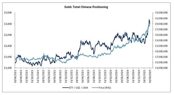 Gillard此前发布的报告显示,4月22日,中国投资者增持120万盎司黄金,金价创下3500美元/盎司的历史新高,成交量亦创新高。