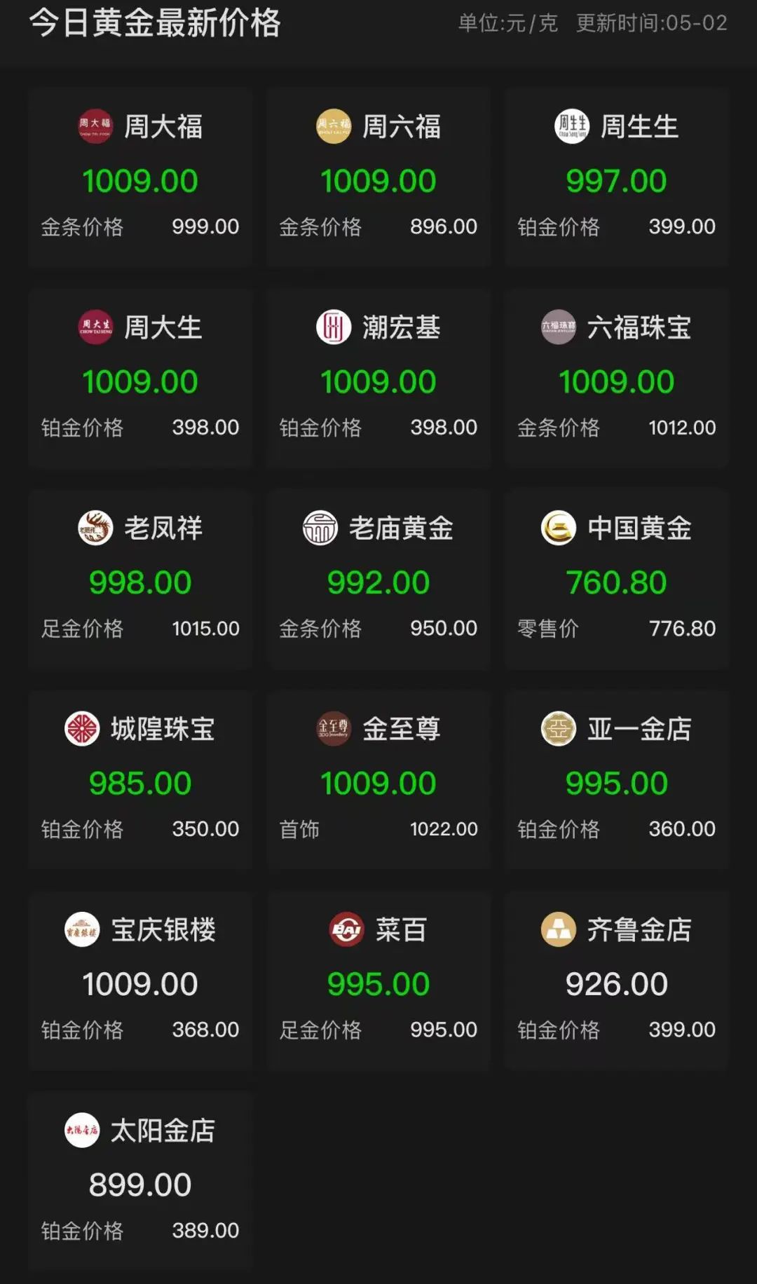 正逢国内五一假期,部分品牌金饰价格却已经跟跌下调。今日(5月2日),周大福、周六福、周大生、潮宏基、六福珠宝足金价格1009元/克,老庙黄金金饰最新标价为992元/克。
