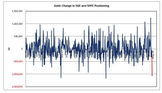 此外,我国市场因五一劳动节假期休市。有境外机构分析,五一假期前夕,中国交易员通过上海期货交易所和上海黄金交易所抛售了总共近100万盎司黄金期货和现货,几乎完全清空了上周买入的仓位,导致在岸总持仓较历史高点有所回落。
