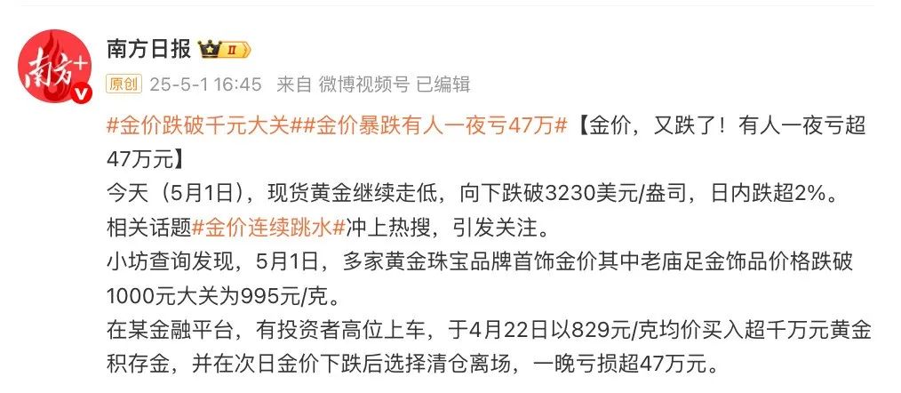 在某金融平台,有投资者高位上车,于4月22日以829元/克均价买入超千万元黄金积存金,并在次日金价下跌后选择清仓离场,一晚亏损超47万元。